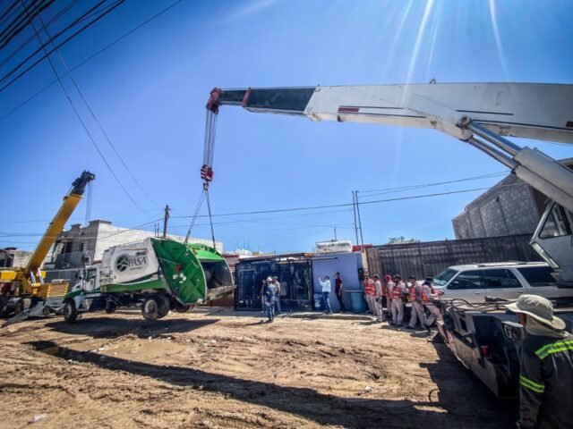 Personal de la JMAS Juárez acudió al cruce de las calles Aeromoza y Aeronáutica con una grúa para realizar las labores de extracción de dos camiones que se quedaron atrapados en una obra concluida que estaba en espera de ser pavimentada.