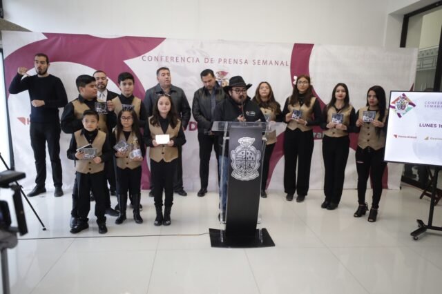 Durante el desarrollo de la rueda de prensa que encabeza el alcalde todos los lunes en el Museo de Arqueología e Historia de El Chamizal, los niños le desearon un feliz cumpleaños cantándole en vivo.