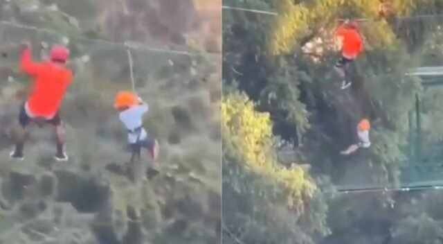 El video compartido en diferentes plataformas muestra cómo un menor de entre 8 y 9 años recorría la tirolesa de 12 metros de altura al lado de su padre cuando de repente el arnés que lo sostenía se reventó.