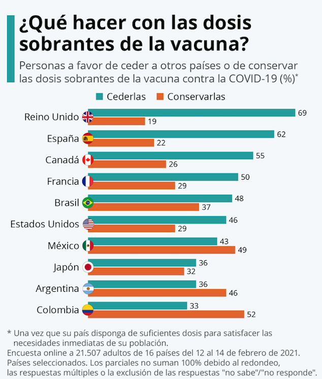 De los países incluidos en el estudio, de los cuales la siguiente infografía ofrece una selección, Reino Unido es el que se muestra como más solidario, pues cerca del 70% de los encuestados considera que, una vez se haya vacunado a la población del país, las autoridades deberían donar ese posible excedente de vacunas. España ocupa el segundo lugar, con un 62% de españoles a favor de que su país ceda las dosis extra de vacunas a países que las necesiten cuando concluya la campaña de vacunación. Sin embargo, en países como Colombia (52%), México (49%) y Argentina (46%), es mayor el porcentaje de ciudadanos a favor de conservar las dosis por si su país las necesita en un futuro.