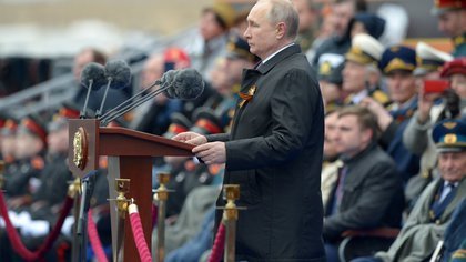 Antes del discurso de Putin, el ministro de Defensa ruso, Sergei Shoigu, en una limusina negra descapotable pasó revista a las tropas alineadas en la Plaza Roja y les deseó un feliz Día de la Victoria. Los soldados vestidos de gala corearon “¡Hurra!” en respuesta.
