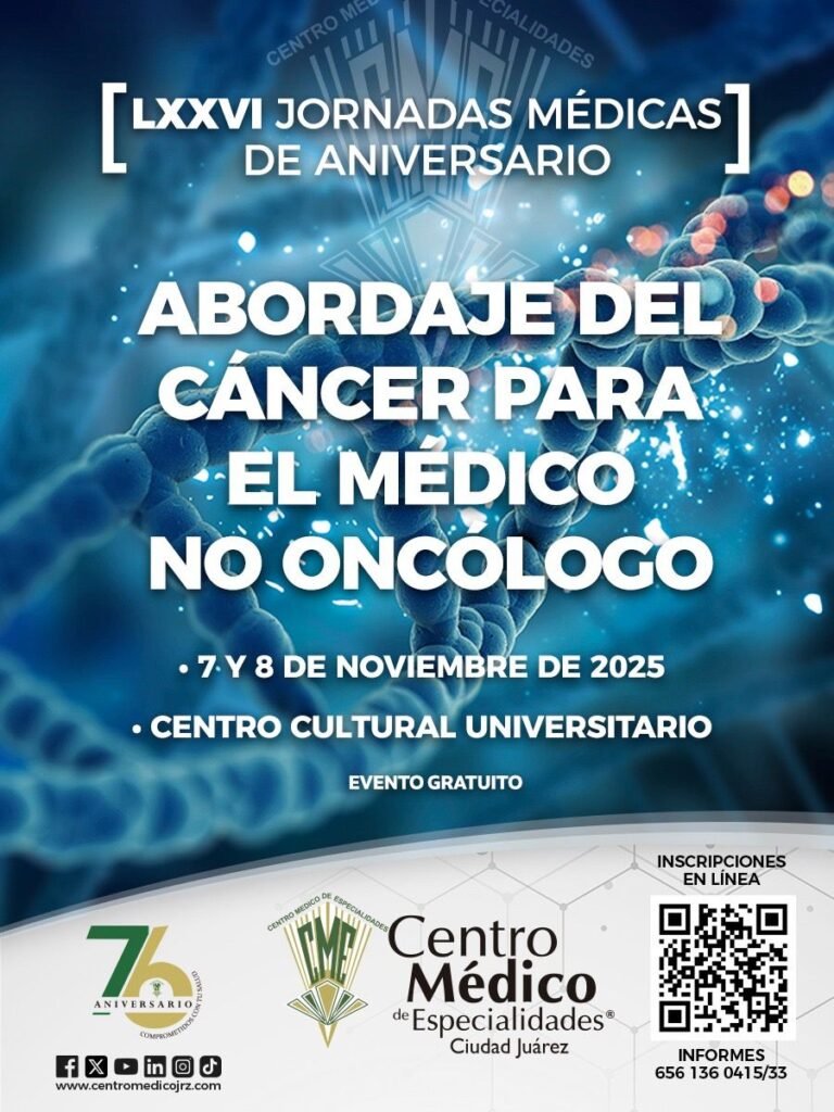 El Centro Médico de Especialidades invita a su personal médico y comunidad de salud a participar en la jornada académica “Abordaje del cáncer para el médico no oncólogo”, que se llevará a cabo los días 7 y 8 de noviembre en el Centro Cultural Universitario, en Ciudad Juárez, Chihuahua.