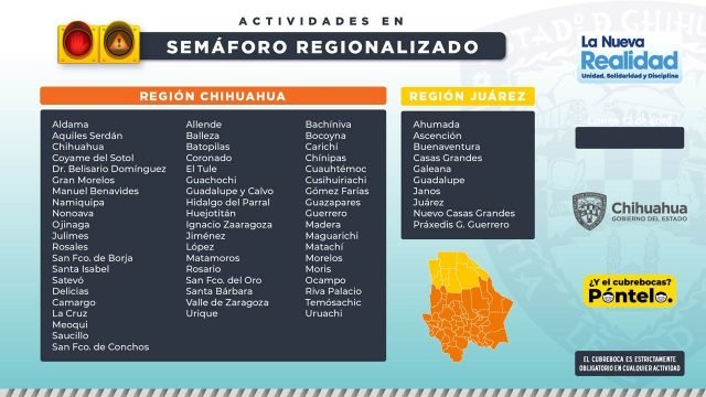 Chihuahua.- El secretario de Salud, Eduardo Fernández Herrera, informó que ante el aumento de contagios de COVID-19 en las últimas dos semanas, vuelve a operar el semáforo epidemiológico regionalizado, por lo que Región Chihuahua cambia a color naranja y Juárez se mantiene en amarillo.