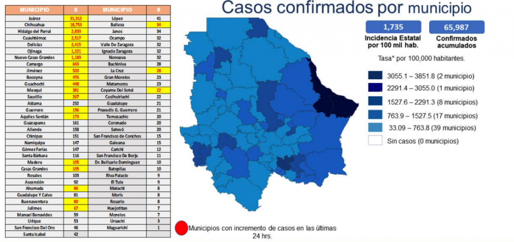 El acumulado de casos confirmados por municipio: 31,312 Juárez, 18,753 Chihuahua, 2,833 Hidalgo del Parral, 2,517 Cuauhtémoc, 2,415 Delicias, 1,221 Ojinaga, 1,183 Nuevo Casas Grandes, 643 Camargo, 520 Jiménez, 476 Bocoyna, 448 Guachochi, 381 Meoqui, 267 Saucillo, 233 Aldama, 196 Guerrero, 173 Aquiles Serdán, 161 Guazapares, 159 Allende, 151 Chínipas, 146 Gómez Farías, 147 Namiquipa, 116 Santa Bárbara, 103 Rosales, 105 Madera, 105 Casas Grandes, 90 Ascensión, 86 Ahumada, 81 Guadalupe y Calvo, 80 Buenaventura, 67 Julimes, 58 Manuel Benavides, 53 Urique, 46 San Francisco del Oro, 42 Santa Isabel, 41 López, 34 Balleza, 32 Nonoava, 34 Janos, 32 Valle de Zaragoza, 32 Ocampo, 31 Ignacio Zaragoza, 28 La Cruz, 28 Bachíniva, 23 Matamoros, 23 Gran Morelos, 22 Cusihuiriachi, 22 Coyame del Sotol, 21 Guadalupe, 21 Praxedis G. Guerrero, 20 Satevó, 20 Coronado, 20 Temósachic, 15 San Francisco de Conchos, 15 Galeana, 12 Carichí, 11 Batopilas, 11 San Francisco de Borja, 10 Dr. Belisario Domínguez, 9 El Tule, 9 Riva Palacio, 8 Moris, 8 Rosario, 8 Matachí, 7 Huejotitán, 7 Morelos, 3 Uruachi y 1 Maguarichi.