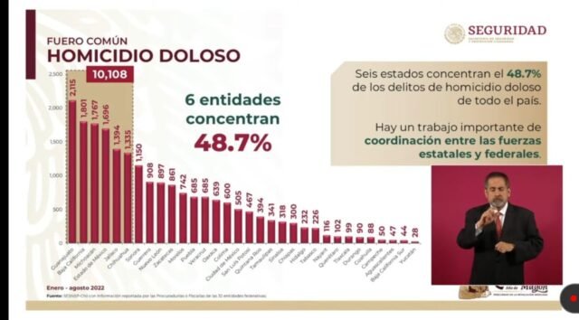 Expuso que seis entidades siguen concentrando 48.7% de los homicidios dolosos de todo el país: Guanajuato, Baja California, Michoacán, Estado de México, Jalisco y Chihuahua. Sin embargo, en el caso de Chihuahua resaltó que van tres meses que está contenido el homicidio en la entidad.