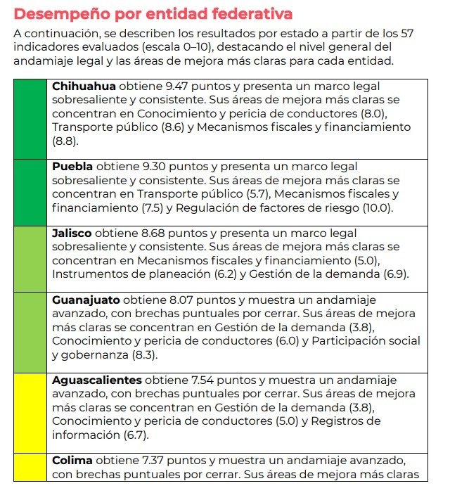 El estudio, denominado Ranking de legislación estatal de movilidad en México, mide el avance en la garantía del derecho a la movilidad y la armonización de los marcos jurídicos estatales con la Ley General de Movilidad y Seguridad Vial (LGMSV). En esta edición se evaluó la normativa vigente al 1 de junio de 2025 en las 32 entidades federativas.