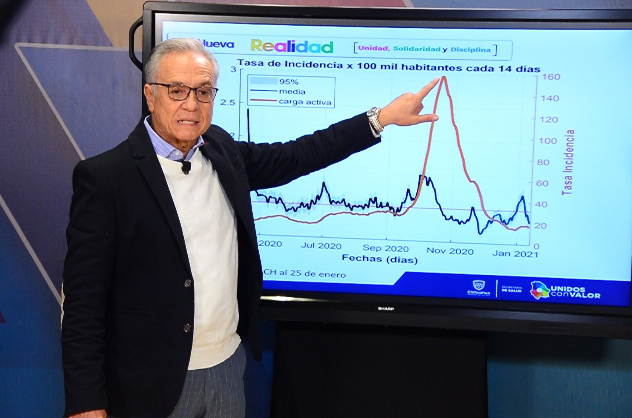 Explicó que en el estado de Chihuahua la curva pandémica se ha estabilizado, luego de su mayor repunte correspondiente a las semanas del pasado mes de octubre, situación que también se presenta en mayor medida en ciudad Juárez.