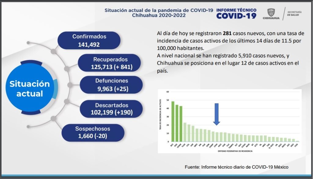 En el país se registraron 5 mil 910 casos nuevos y el estado de Chihuahua se posiciona en el lugar 12 de casos activos a nivel nacional, de forma que muestra una tasa de incidencia de los últimos 14 días, de 11.5 casos activos por cada 100 mil habitantes.