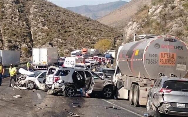 Al parecer, un tráiler se quedó sin frenos la tarde del domingo y chocó contra una veintena de vehículos a la altura del kilómetro 230 de la carretera 57, que comunica Matehuala y Saltillo, dijo Jorge Mesa, jefe de guardia de los bomberos de la localidad de Arteaga.
