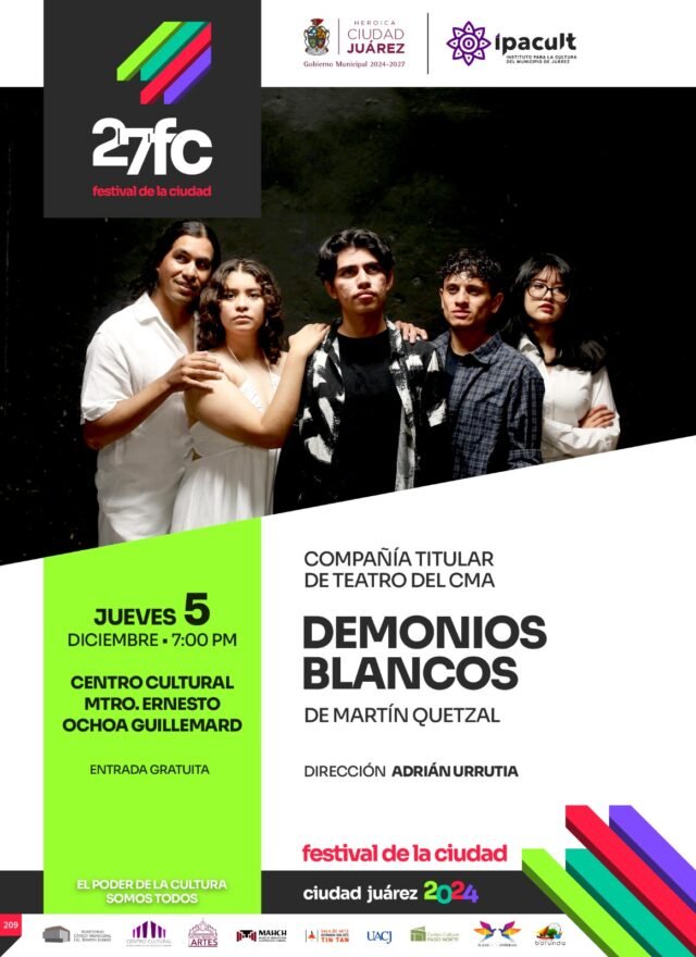 La directora del IPACULT, Myrna Judith Barajas Martínez, destacó que “Demonios Blancos” es una de las 38 actividades que se realizan dentro del Festival de la Ciudad, el cual se celebra del 30 de noviembre al 10 de diciembre para conmemorar los 365 años de la fundación de Ciudad Juárez.