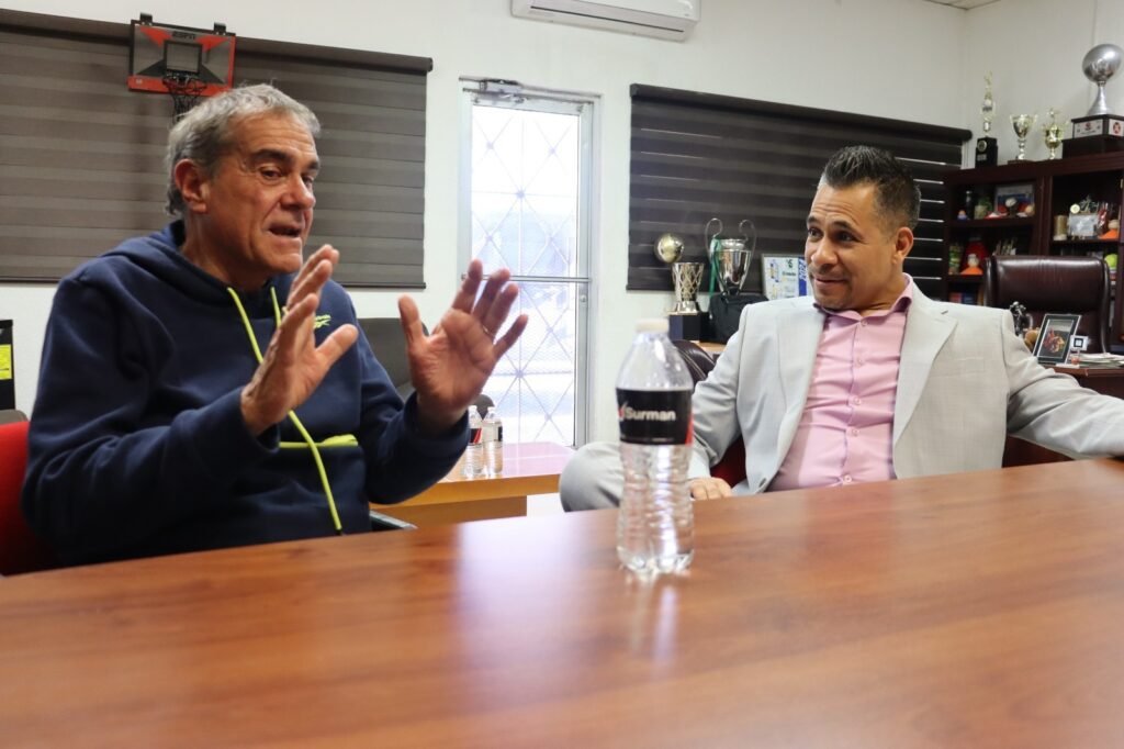 El coach uruguayo Miguel Volcán Sánchez compartió una amena plática con el director del Instituto Municipal del Deporte y Cultura Física de Juárez (IMDEJ), Juan Carlos Escalante.