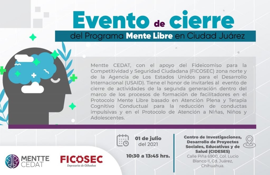 Mentte CEDAT, con el apoyo del Fideicomiso para la Competitividad y Seguridad Ciudadana (FICOSEC) Zona Norte y de la Agencia de Los Estados Unidos para el Desarrollo Internacional (USAID), llevará a cabo el cierre de actividades de la segunda generación dentro del marco de los procesos de formación de facilitadores en el Protocolo Mente Libre basado en Atención Plena y Terapia Cognitivo Conductual para la reducción de conductas impulsivas y en el Protocolo de Atención a Niñas, Niños y Adolescentes, que se llevaron a cabo desde marzo de 2020 hasta mayo de 2021.