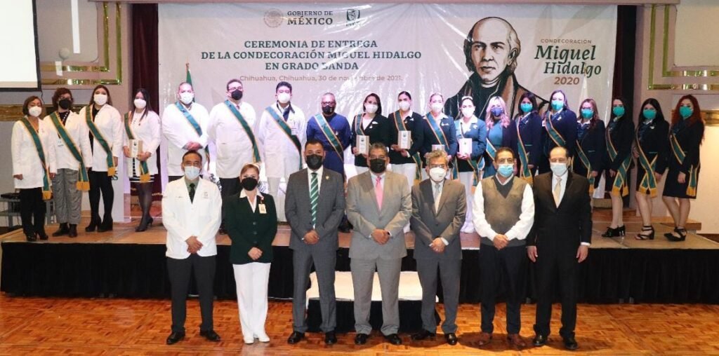 El titular del Instituto Mexicano del Seguro Social (IMSS) en Chihuahua, el doctor Arturo Daniel Bonilla y Calderón, entregó a 20 trabajadores de la salud la Condecoración Miguel Hidalgo en grado Banda por méritos distinguidos en la atención de la emergencia sanitaria provocada por el virus SARS-CoV2 (Covid-19).