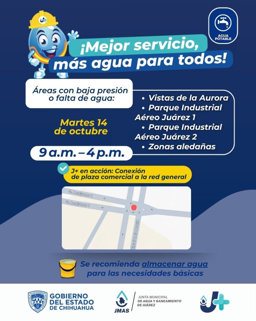 La Junta de Agua y Saneamiento de Juárez (J+) informa que este martes 14 de octubre realizará la conexión de una plaza comercial a la red general de agua potable.