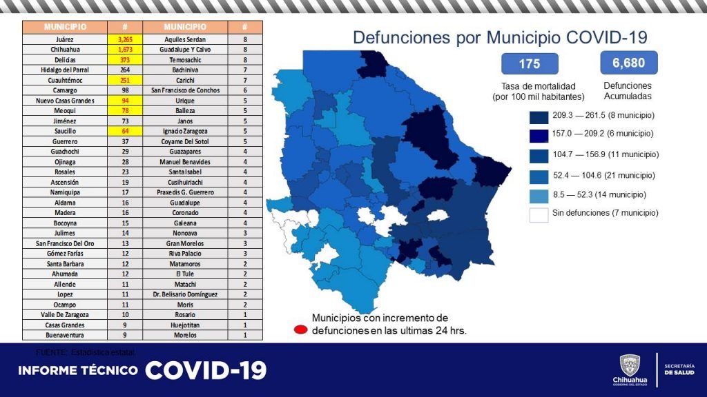 El reporte indica que 29 de las nuevas defunciones corresponden a Juárez, 17 a Chihuahua, 2 a Delicias, 5 a Cuauhtémoc, 2 a Saucillo, una a Nuevo Casas Grandes y una a Meoqui.