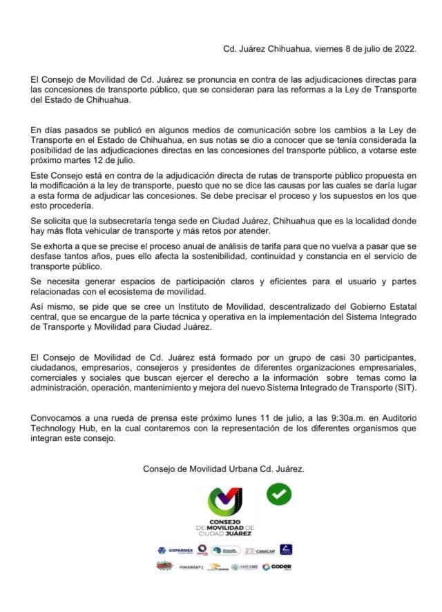 Dentro de los cambios a la Ley de Transporte del Estado en Chihuahua, a votarse este 12 de julio, se contempla la posibilidad de las adjudicaciones directas en las concesiones del transporte público, mismas que el Consejo de Movilidad de Cd. Juárez se pronuncia en contra.