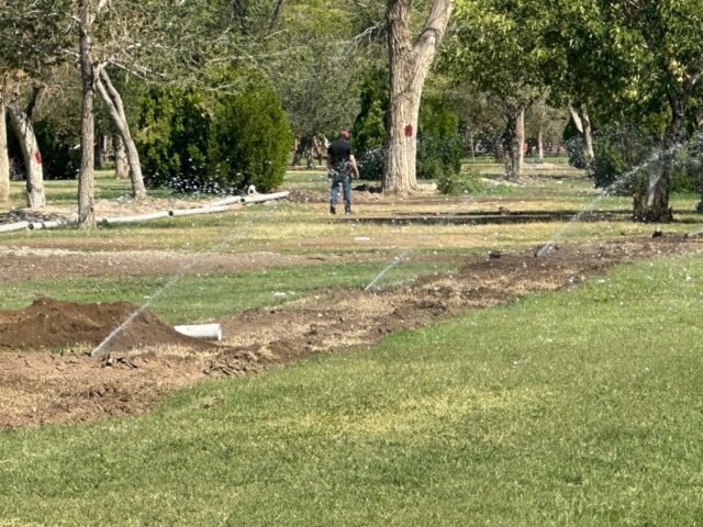 Personal de la Dirección de Parques y Jardines continúa trabajando en la instalación del sistema de riego del parque El Chamizal, informó Daniel Iván Zamarrón Saldaña, director de la dependencia.