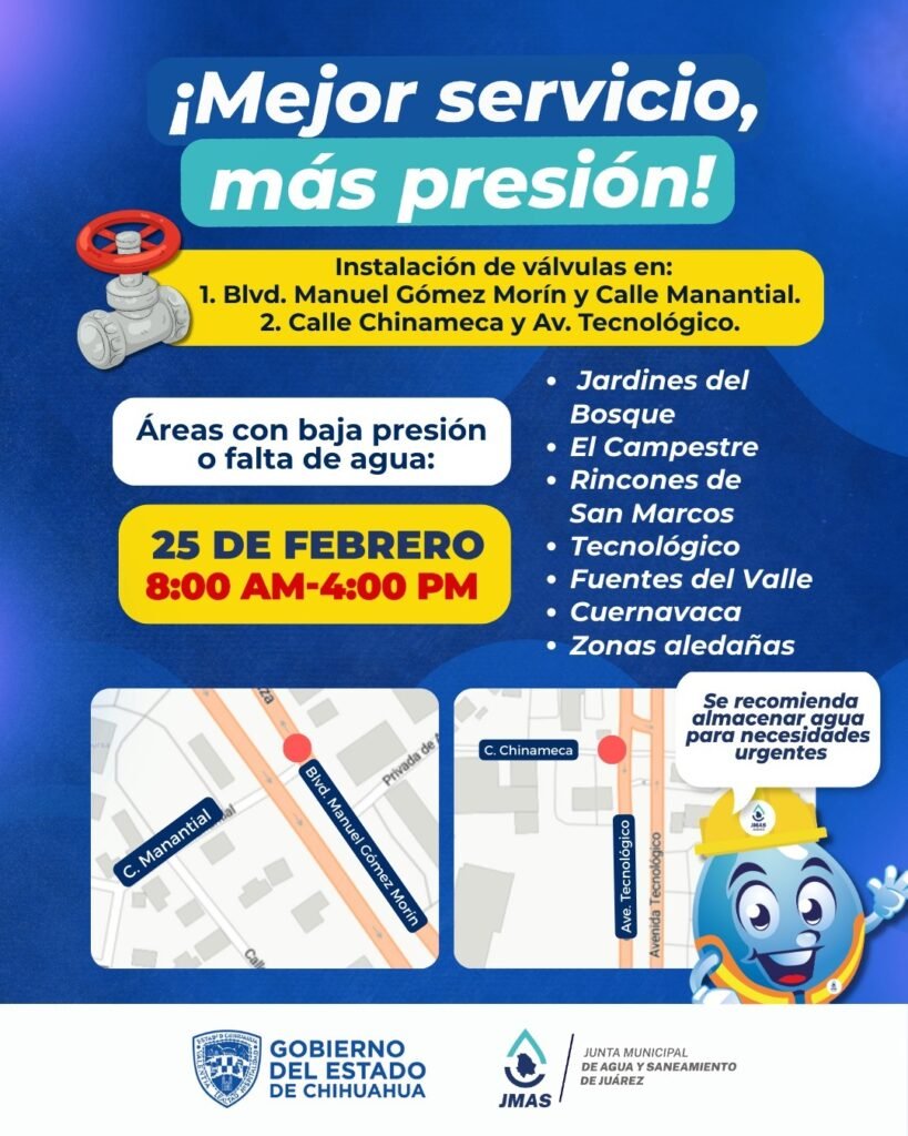 Este miércoles 25 de febrero, el Departamento de Eficiencia Física de la Junta de Agua y Saneamiento de Juárez, instalará 2 válvulas nuevas, como parte de las acciones de sectorización del distrito 5.