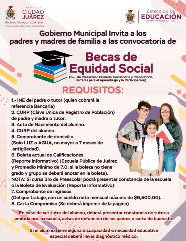 Además es necesario presentar una copia del acta de nacimiento del estudiante, una copia del comprobante de domicilio (luz o agua) no mayor a 7 meses de antigüedad, una copia de la boleta actual de calificaciones con promedio de 7.0, una copia del comprobante de ingresos (con sueldo neto no máximo a 9 mil 500 pesos) y una carta compromiso, la cual podrá imprimirse en la página www.juarez.gob.mx/educación-becas