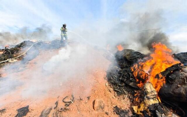 La tarde de este miércoles se empezó a presentar un incendio en un área de 400 metros en el relleno sanitario y aunque se controló a la brevedad fue imposible apagarlo por completo debido a los fuertes vientos que complicó la labor de los bomberos.