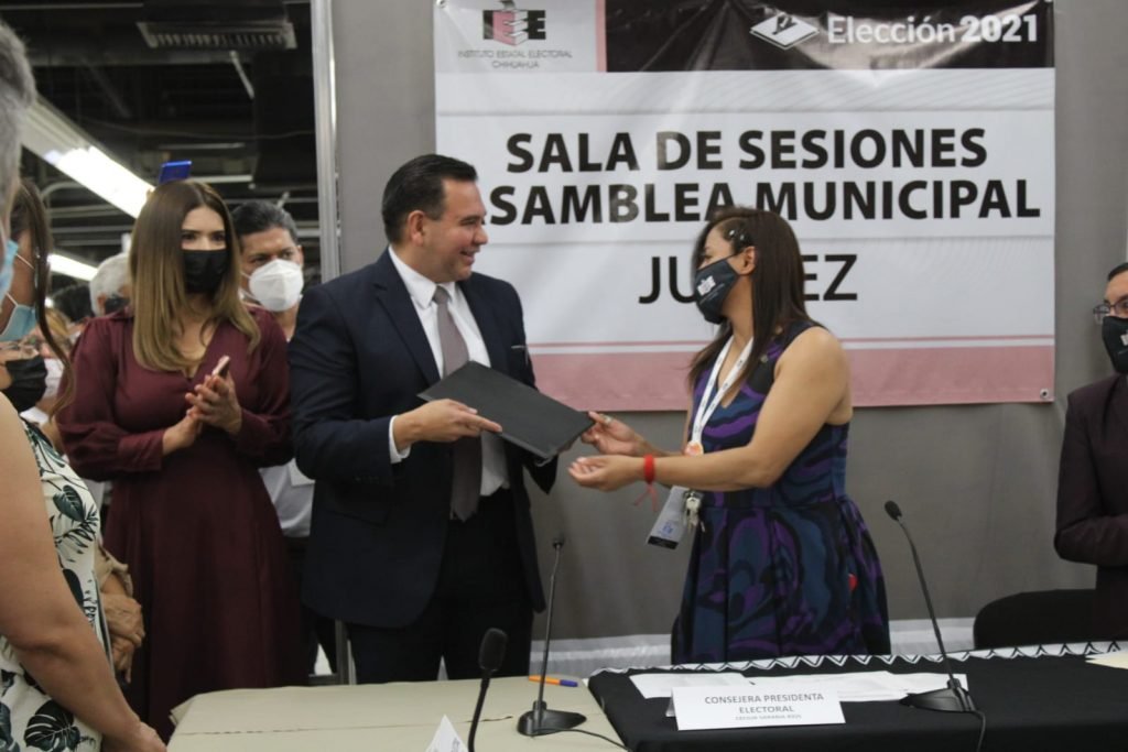 Sarabia Ríos entregó la constancia de mayoría al candidato electo, Cruz Pérez Cuéllar, y a 11 regidores que forman parte de la planilla del ayuntamiento de Ciudad Juárez.
