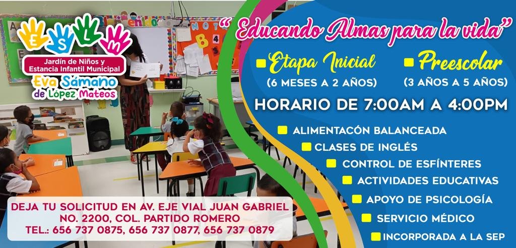 La Estancia Infantil Municipal Eva Sámano de López Mateos tiene espacios para niños de etapa inicial que contempla de los 6 meses a los 2 años y para preescolar de 3 a 5 años de edad, por lo que invitan a que empleados municipales interesados en inscribir a sus hijos, llenen la solicitud para registrarlos.