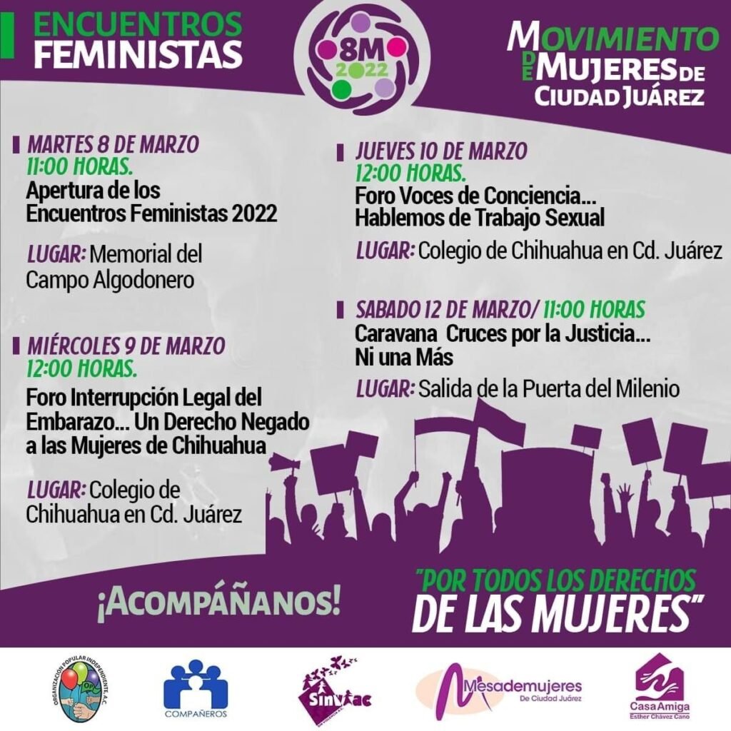 Yadira Cortez, representante de Red Mesa de Mujeres, informó que para este martes 8 de marzo llevará a cabo el programa. Apertura de los encuentros feministas 2022 que se tendrá lugar en el Campo Algodonero, a partir de las 11:00 de la mañana.