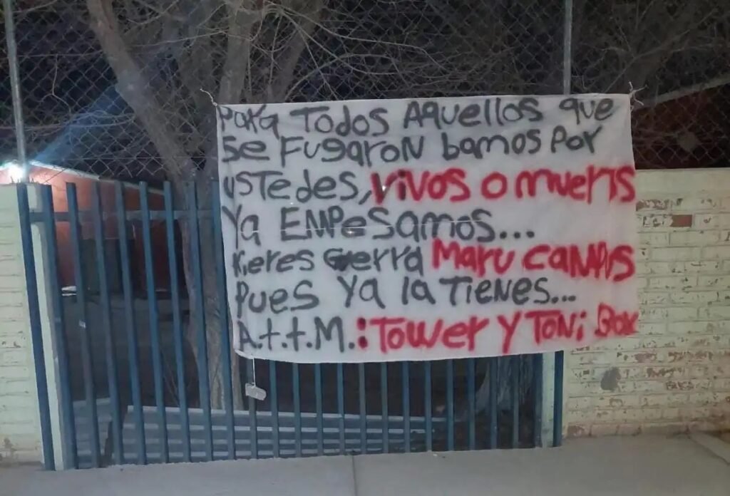 A través de una narcomanta que fue dejada en la escuela primaria Frida Kahlo, en la colonia Elena Arizmendi Mejía, grupos delictivos declararon la guerra a la gobernadora María Eugenia Campos Galván y señalaron que capturarán vivos o muertos a los reos prófugos del Cereso Estatal No. 3 de Ciudad Juarez.