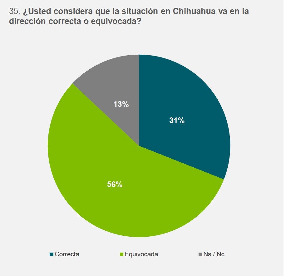 Adicionalmente, el 56% de las personas que participaron en la encuesta considera que la situación en Chihuahua va en la dirección equivocada, solo el 31 por ciento dijo que va en la dirección correcta, mientras que el 13 por ciento no respondió o dijo no saber.