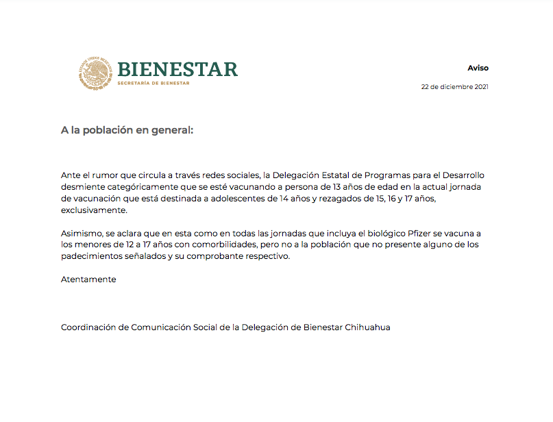 La Delegación Estatal de Programas para el Desarrollo planteó su postura ante los rumores que circulan a través de las redes sociales sobre una supuesta vacunación a los menores de 13 años en el estado, la cual han desmentido por medio de un comunicado.