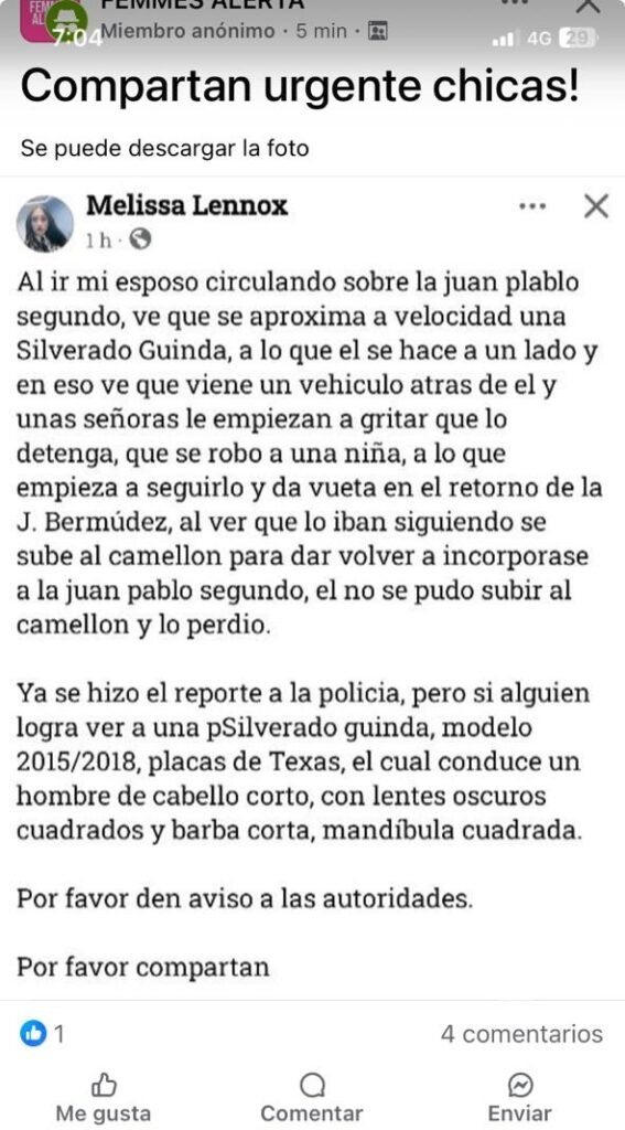 Respecto al supuesto caso de rapto de una niña por un hombre que circulaba en una Silverado guinda, que se está difundiendo en redes sociales y que habría ocurrido en el bulevar Juan Pablo II de esta ciudad, la SSPM aclara que se trata de un problema de violencia familiar y sustracción de menor.