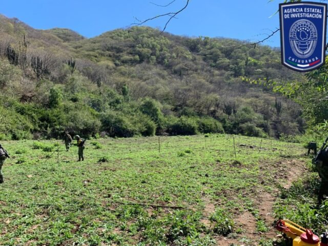 Elementos de la Agencia Estatal de Investigación (AEI) con destacamento en el municipio de Guadalupe y Calvo que participan en el operativo conjunto de seguridad en la comunidad de San José del Rincón y localidades aledañas, localizaron y destruyeron un plantío de amapola.