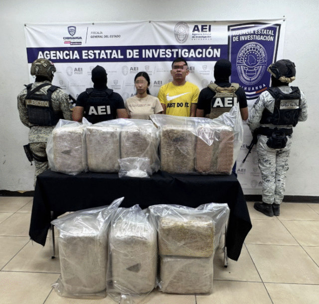 En un operativo coordinado con el Ejército Mexicano y la Guardia Nacional, elementos de la Agencia Estatal de Investigación, adscritos a la Fiscalía de Distrito Zona Norte, detuvieron a un masculino identificado como Jesús Jonathan H. F., de 28 años y a una mujer de nombre Miriam R. R., de 27 años de edad, por la posesión de una considerable cantidad de droga, en Ciudad Juárez