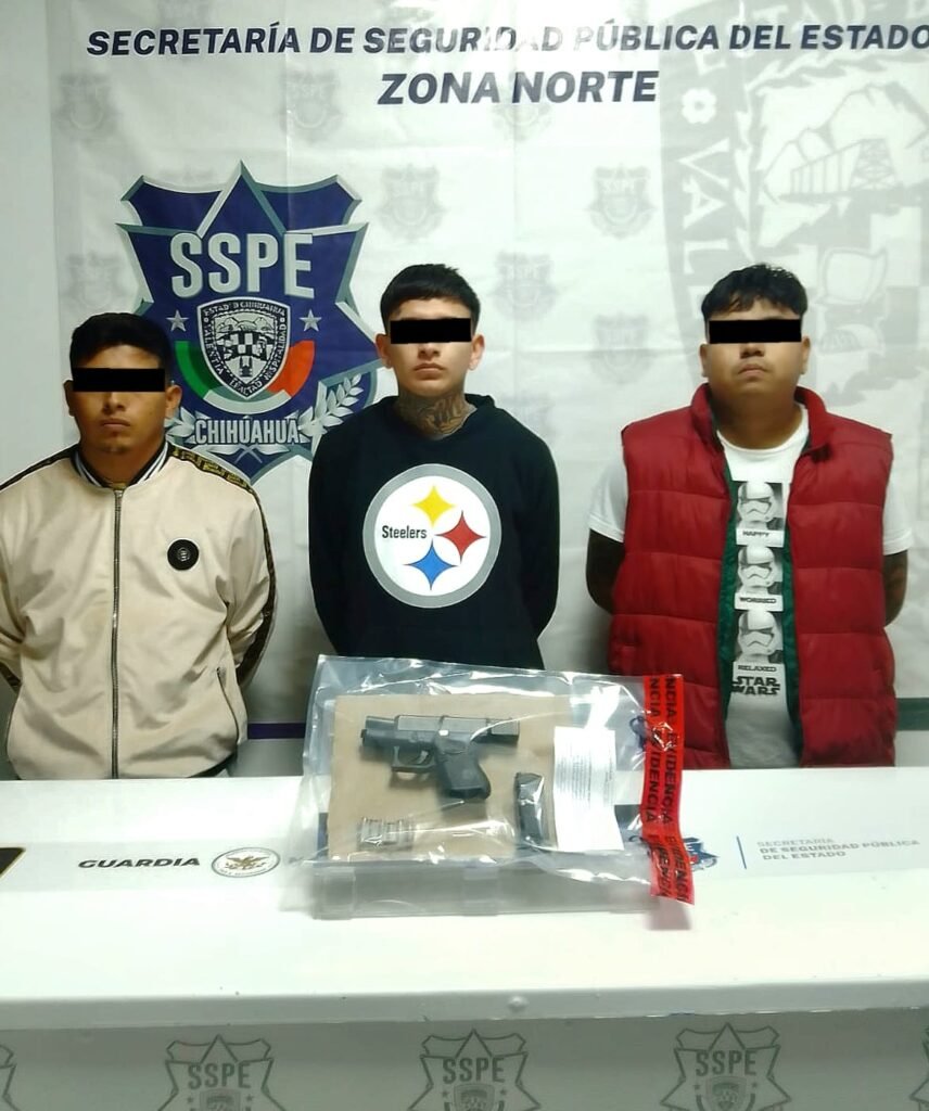 Elementos de la Secretaría de Seguridad Pública del Estado (SSPE), adscritos a Zona Norte, detuvieron en Ciudad Juárez a 3 sujetos a los que aseguraron un arma de fuego calibre .40 milímetros.