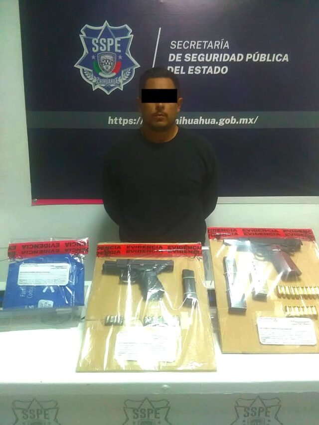 Elementos del Grupo Especial de Detectives de la Secretaría de Seguridad Pública del Estado (SSPE) detuvieron en Ciudad Juárez a un sujeto que se identificó como escolta particular y quien portaba un arma de fuego calibre .45 que no contaba con el registro correspondiente.