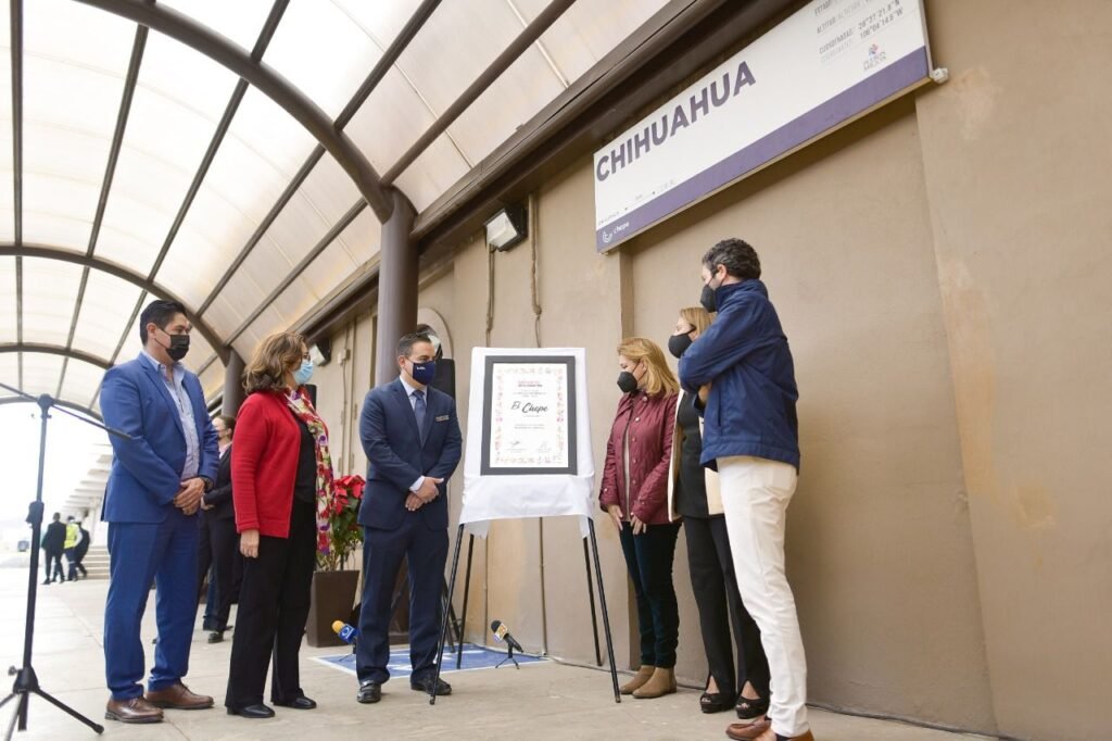 Como parte de la celebración de los 60 años de servicio del tren Chepe, la gobernadora Maru Campos, en compañía de la secretaria de Innovación y Desarrollo Económico María Angélica Granados Trespalacios y el secretario de la Coordinación de Gabinete, Luis Serrato Castell, dieron la bienvenida a la embajadora María de Lourdes Aranda, directora de Relaciones con Gobierno de Grupo México y a directivos de Grupo México Transportes; ente operador del tren Chepe, con el fin de develar la placa conmemorativa en apoyo al desarrollo turístico de Chihuahua.