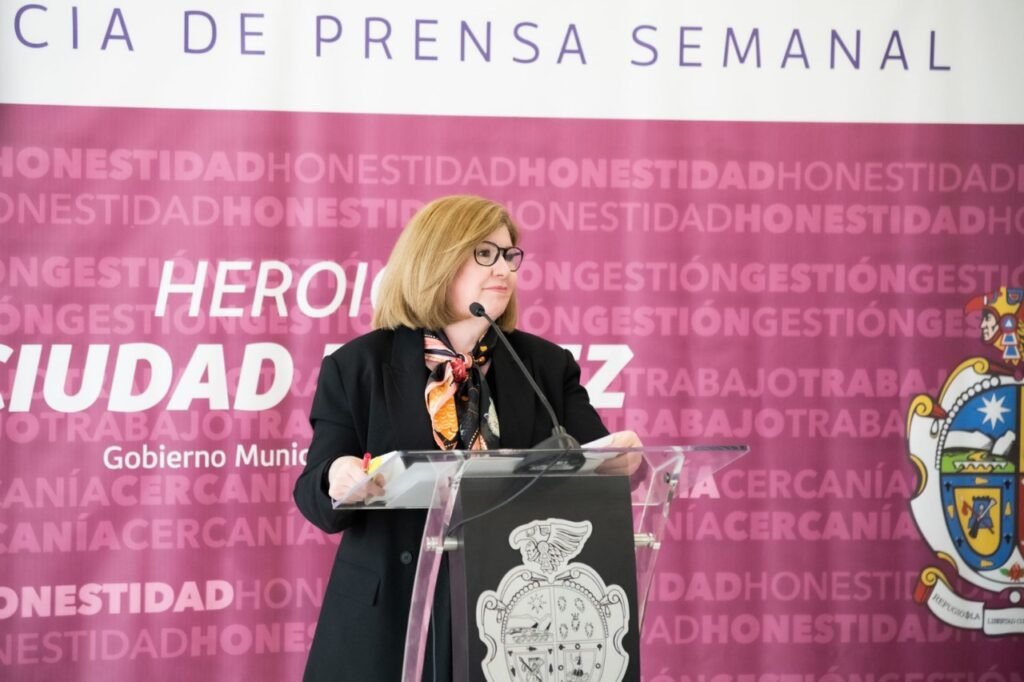 Lucía Chavira, directora general del Sistema para el Desarrollo Integral de la Familia de Juárez, anunció la Convocatoria de apoyos económicos para la atención, cuidado y desarrollo integral de niñas, niños y adolescentes 2022 esta mañana en la rueda de prensa semanal, junto al alcalde Cruz Pérez Cuéllar.