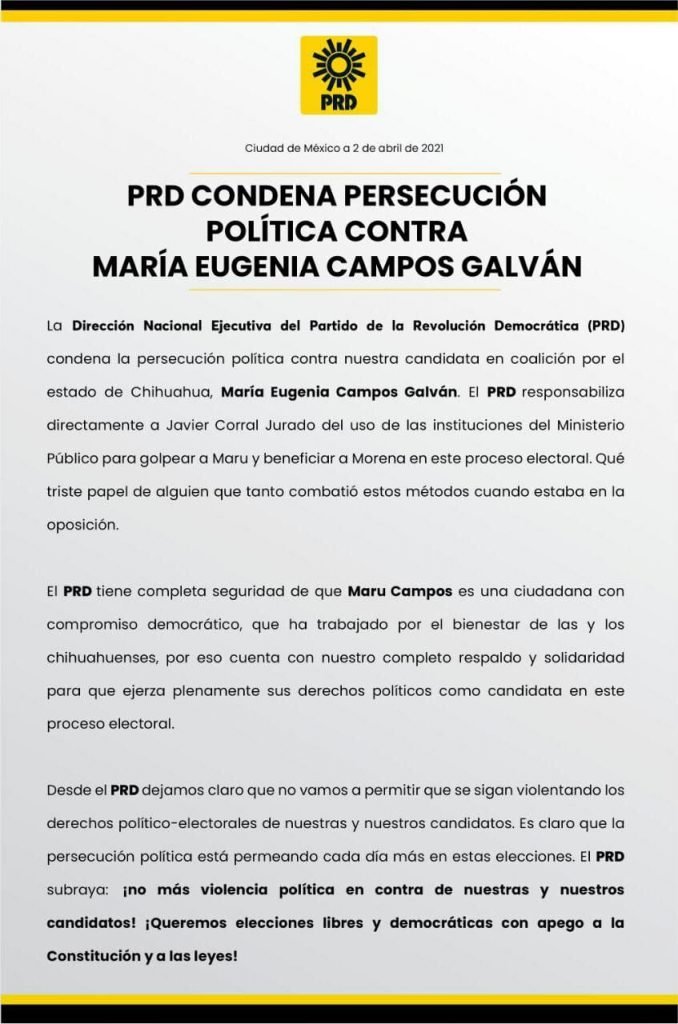 Mientras tanto, en el Partido de la Revolución Democrática (PRD), el dirigente nacional de este partido, Jesús Zambrano acusó al gobernador del estado, Javier Corral de beneficiar a MORENA en este proceso electoral con el uso del Ministerio Público para golpear a Maru Campos. Además, señaló que desde el PRD no se va a permitir que se sigan violentando los derechos político-electorales de sus candidatos. A este mensaje del dirigente perredista, se sumó el expresidente del PRD, Jesús Ortega.