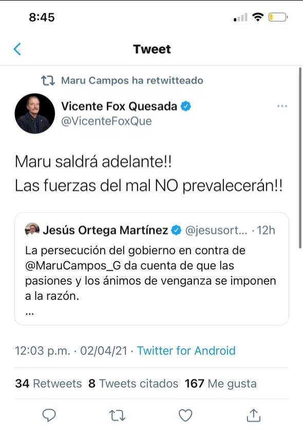 En un mensaje en redes sociales, el presidente nacional del PAN, Marko Cortés, señaló que Maru Campos tiene todo el respaldo de su partido para seguir adelante, por ser una mujer de resultados y será la próxima gobernadora del estado.