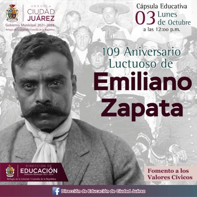 La Dirección de Educación Municipal, invita a los juarenses a disfrutar mañana de la cápsula educativa sobre el 109 aniversario luctuoso de Emiliano Zapata.