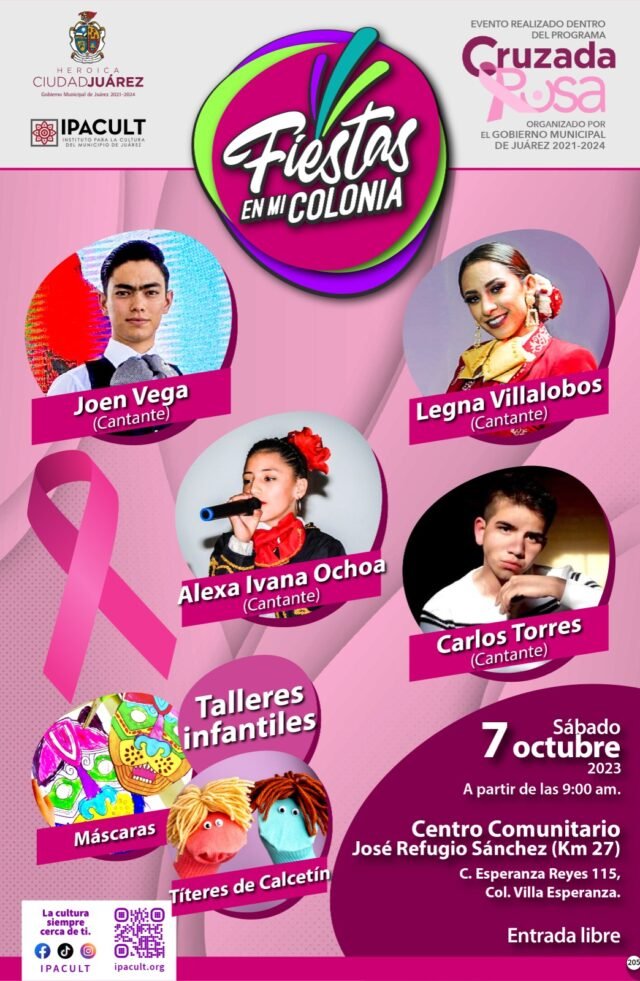 El próximo sábado 07 de octubre, a partir de las 9:00 de la mañana, se presentará “Fiestas en mi colonia”, programa del Instituto para la Cultura del Municipio que estará en la Cruzada Rosa que organiza el Gobierno Municipal.