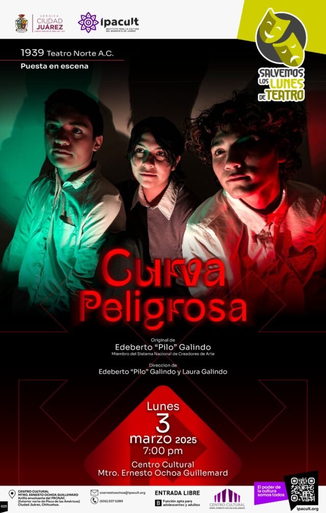 El Instituto para la Cultura del Municipio de Juárez (IPACULT) reafirma su compromiso con la difusión del arte y la cultura en la ciudad al invitar a la comunidad juarense a disfrutar de manera gratuita la puesta en escena “Curva Peligrosa”, del reconocido dramaturgo Edeberto “Pilo” Galindo.