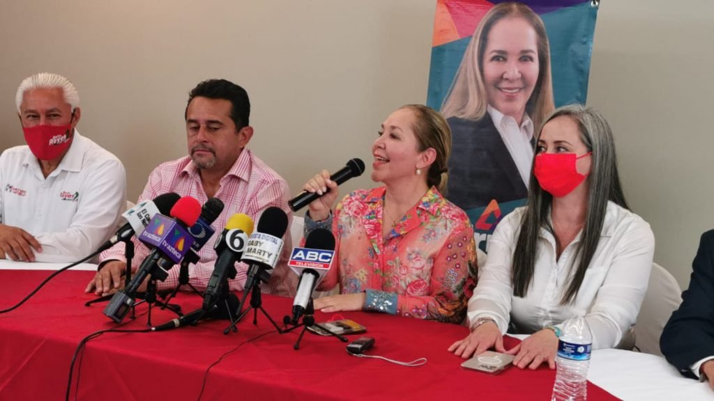 En conferencia de prensa, la candidata a la Alcaldía Adriana Fuentes estuvo flanqueada por el dirigente municipal del tricolor y el resto de los candidatos.