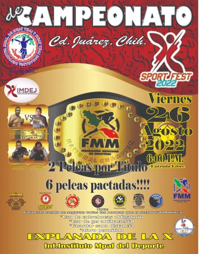 El Instituto Municipal del Deporte y Cultura Física de Juárez y la Liga Municipal de Muay Thai, invitan a la población en general a presenciar las peleas del campeonato nacional en el marco de los festejos del Sport Fest 2022.