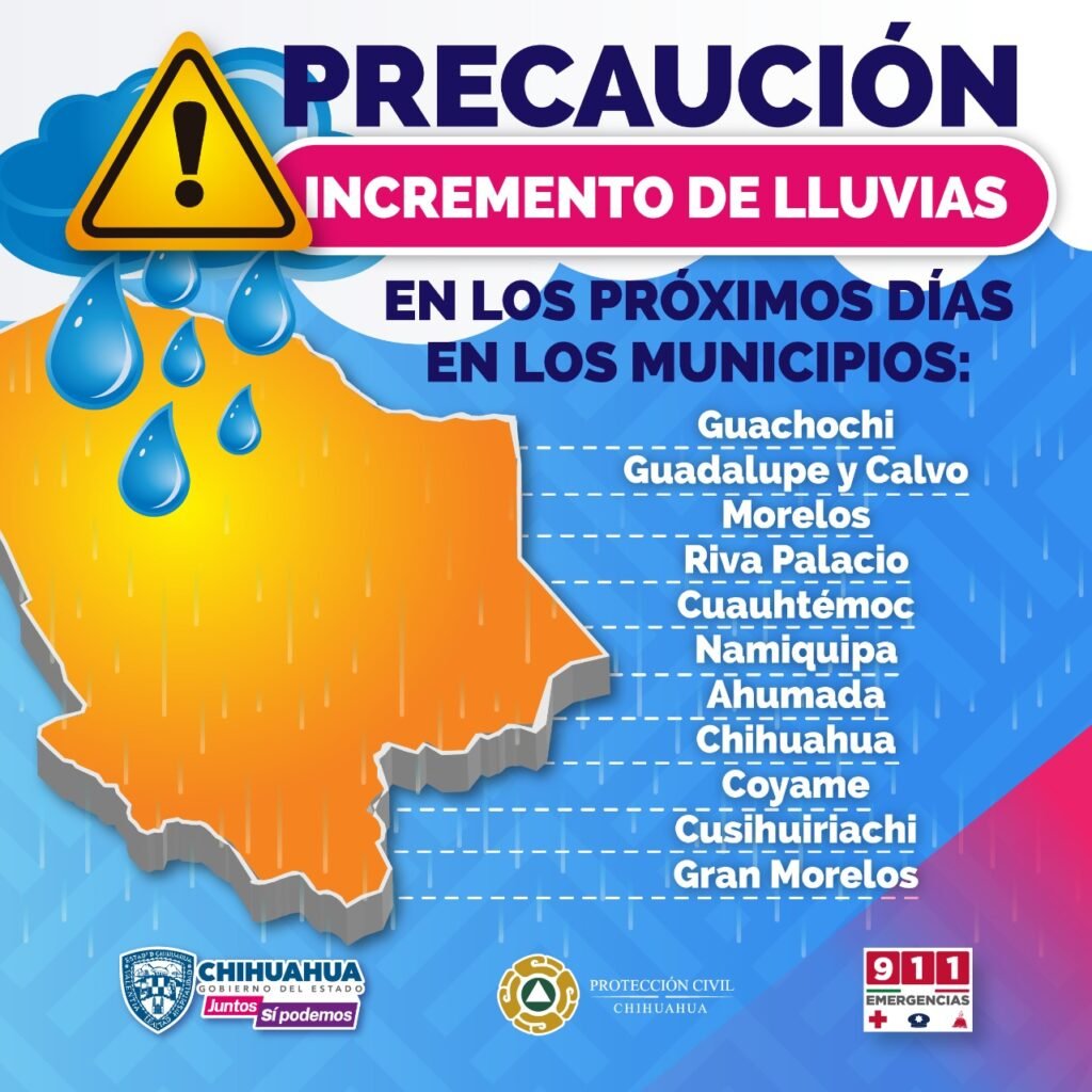 Para el próximo viernes 7 se esperan lluvias de moderadas a puntualmente fuertes en Janos, Casas Grandes, Madera, Nuevo Casas Grandes, Galeana, Ignacio Zaragoza, Gómez Farías, Buenaventura, Namiquipa, Temósachi, Matachí, Bachíniva, Moris, Ocampo, Guerrero, Bocoyna, Balleza, Cuauhtémoc, Chihuahua, Belisario Domínguez y San Francisco de Borja.