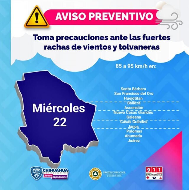 Con base en la información generada por el Servicio Meteorológico Nacional y de la Junta Central de Agua y Saneamiento, la CEPC indicó que para la tarde y noche de este martes, se esperan vientos con intensidad superior a los 95 kilómetros por hora (km/h) en Nonoava, Balleza, Majalca, San Francisco de Borja, Rosario, Santa Bárbara, San Francisco del Oro y Matamoros.