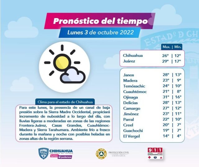 Las precipitaciones se presentarán durante la tarde de este lunes 3 de octubre en zonas de las regiones fronterizas como Juárez y Casas Grandes; Cuauhtémoc-Madera y Sierra Tarahumara.