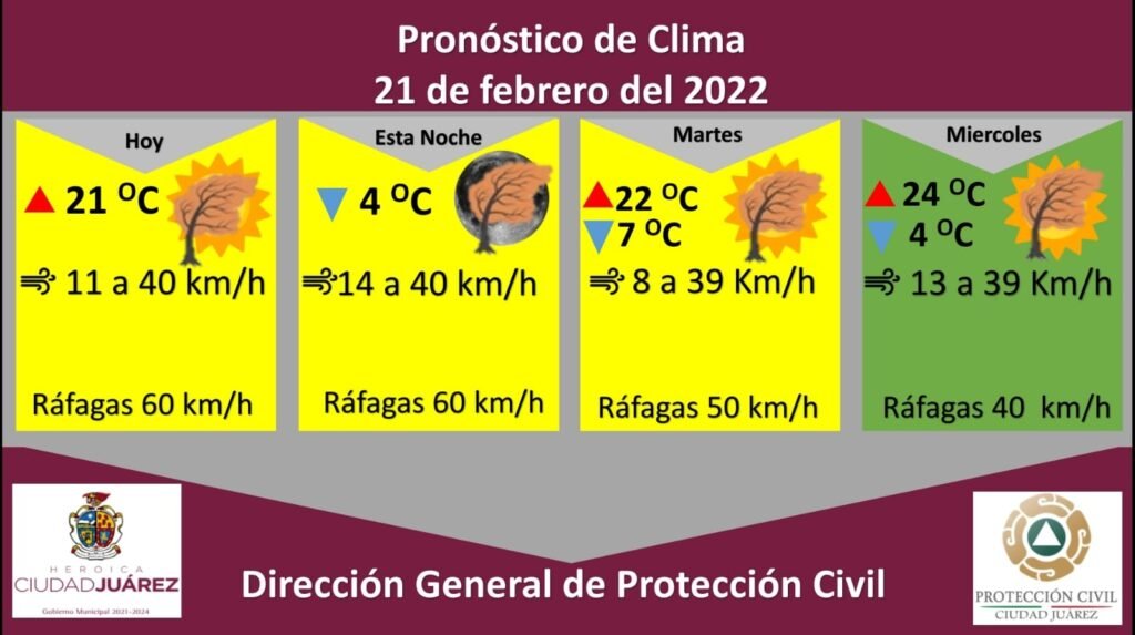 Roberto Briones Mota, titular de la dependencia, dijo que para hoy se espera una temperatura máxima de 21 °C, mientras que la mínima será de 4 °C, con vientos de 11 a 40 kilómetros por hora durante el transcurso del día.