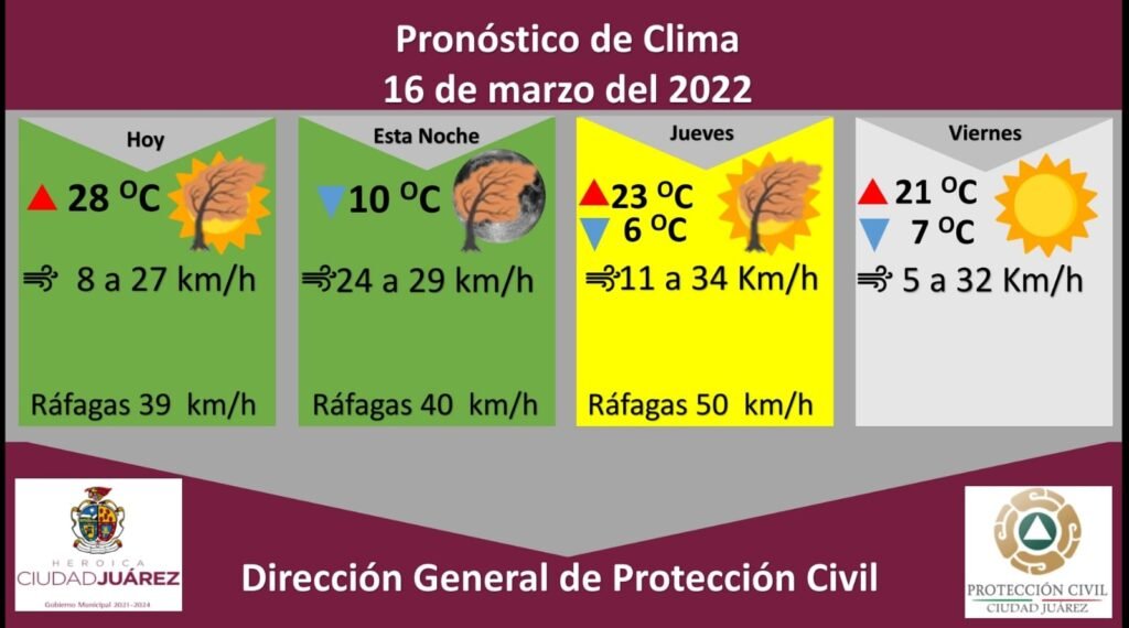 Roberto Briones Mota, titular de la dependencia, dijo que para hoy se espera una temperatura máxima de 28 °C, mientras que la mínima será de 10 °C, los vientos oscilarán de 8 a 29 kilómetros por hora durante el día.