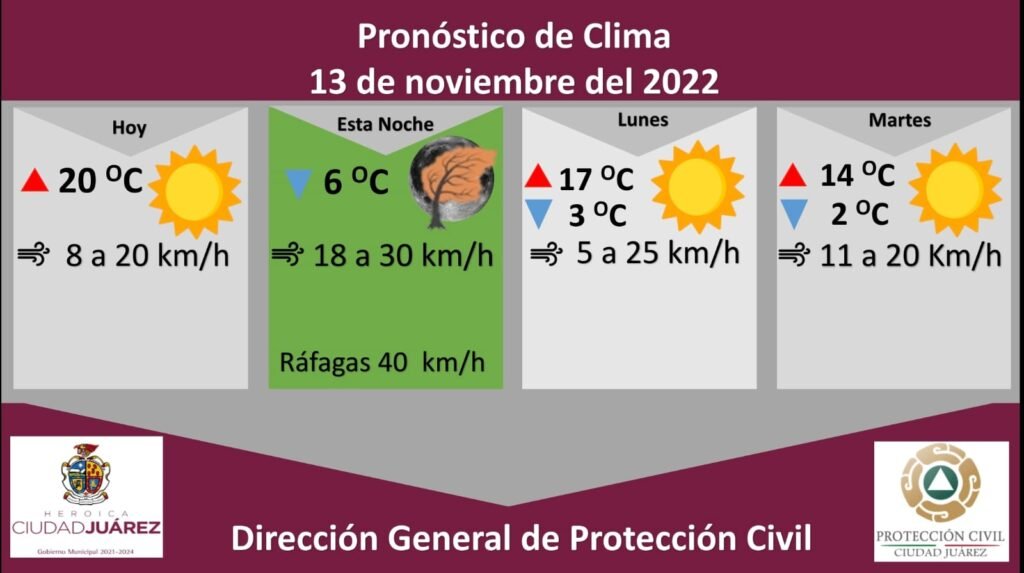 Para mañana lunes se espera un día soleado con una temperatura máxima de 17 °C y mínima de 3 °C, la velocidad del viento se pronostica de 5 a 25 kilómetros por hora.
